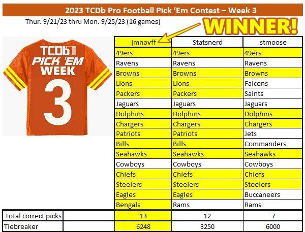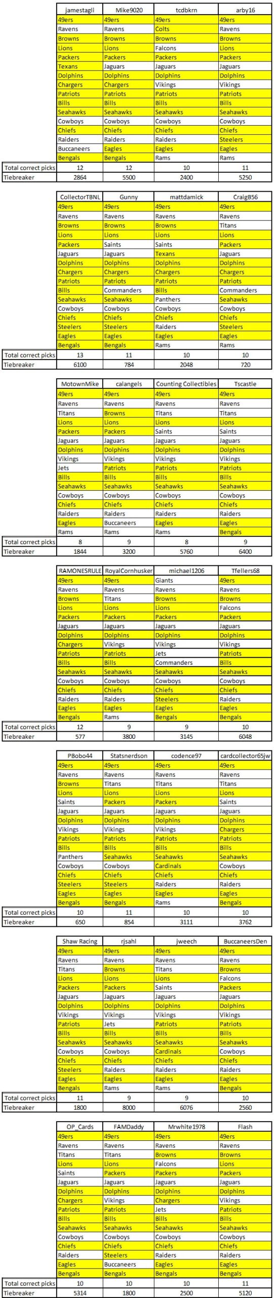 You guys are awesome. Sorry for the delay in declaring a winner. After corrections were made, jmnovff and CollectorTBNL tied at 13 correct picks. For their tiebreaker predictions, jmnovff predicted 6248 punting yards while CollectorTBNL predicted 6100 punting yards. Let's do some tiebreaker math (grand total punting yards) with the assistance of espn.com stats. Perhaps Mrs. S. can double check my math.