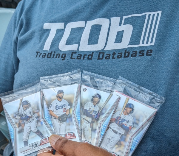Almost every time the Dodgers give away cards at the stadium, I'm there. Pretty much as soon as Topps announced it, I decided I was going to the Sunday July 30 game vs.the Reds for the card giveaway. (Some stadiums have already had their Topps card giveaway while others are coming up soon.) I got to the ballpark early and saw some of the Reds doing their pregame warmups (including throwing around a football).