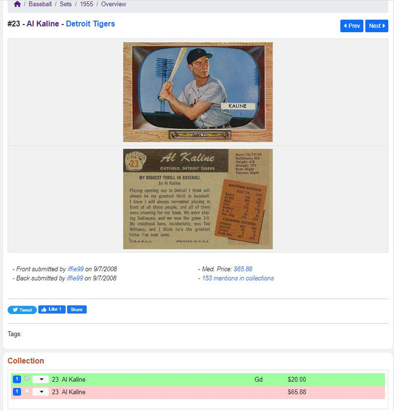We can dig through the system to find prices that members have for cards, but it's rather tedious dependng on the card and how many of each are listed in the various collections (Collection, Wants, Trade/Sale).