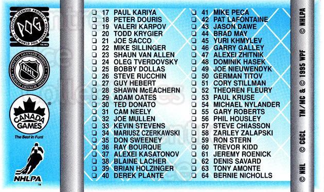I have seen the checklist cards for the set and they are actually listed as 1 to 16 with Paul Kariya starting the Mighty Ducks players at 17. Been working on this for a while now, here are some images ...........
